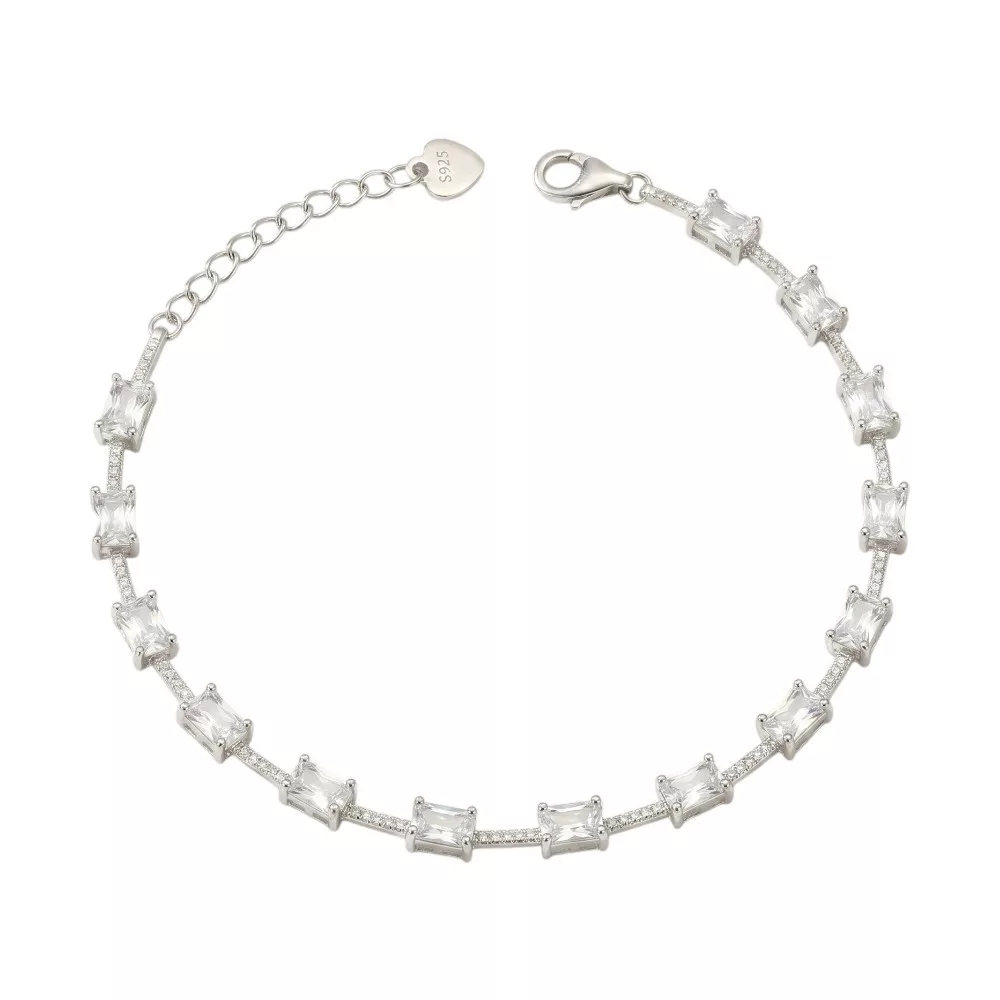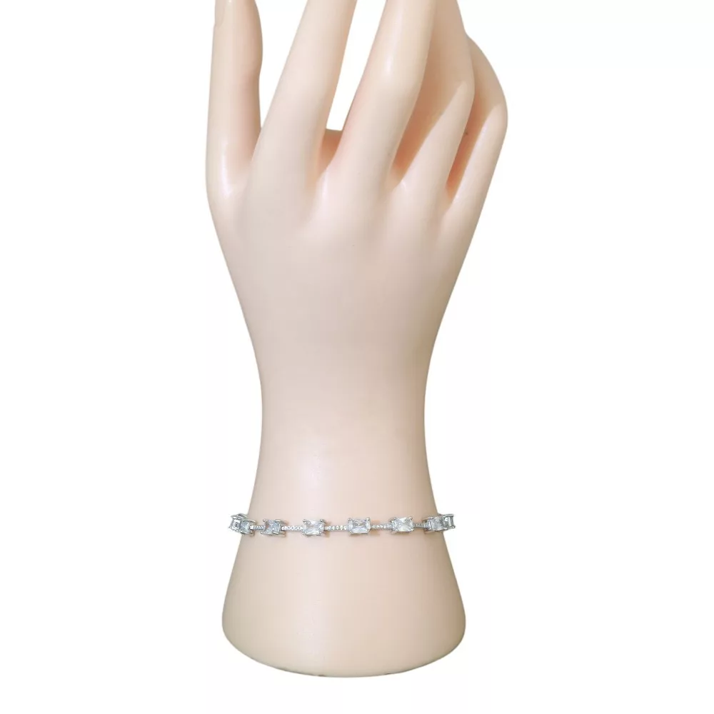 Varázsold különlegessé megjelenésedet ezzel a prémium minőségű, 925 sterling ezüst karkötővel! Ez az ékszer a modern design és a klasszikus csillogás tökéletes ötvözete, melyet a precízen foglalt, téglalap alakú kövek tesznek igazán látványossá. A karkötő hűvös, ezüstös fénye és a kövek tiszta ragyogása minden öltözéket elegánssá tesz.
