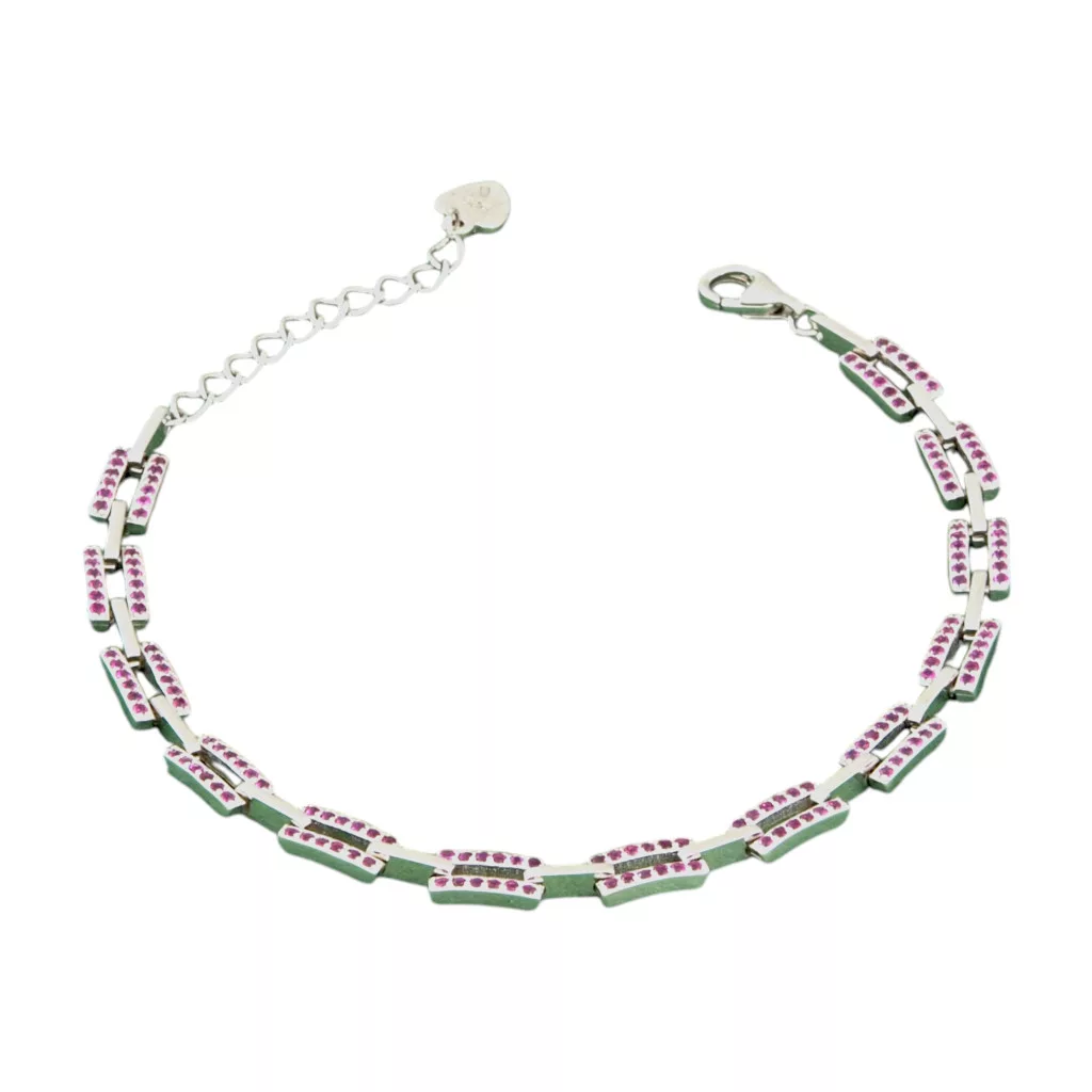 Varázsolja különlegessé a mindennapokat ezzel a lenyűgöző, modern vonalvezetésű ezüst karkötővel! Az ékszer finom eleganciáját a különleges, téglalap alakú láncszemek adják, amelyeket apró, szikrázóan ragyogó, élénk rózsaszín (magenta) kristályok sora díszít. Ez a kifinomult, mégis játékos színkombináció garantáltan magára vonzza a tekinteteket, és nőies bájt kölcsönöz viselőjének, legyen szó egy laza hétköznapi szettről vagy egy elegáns esti eseményről.