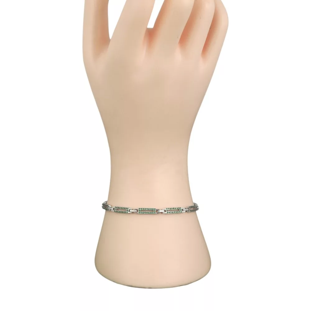 Fedezze fel ezt az egyedi kialakítású ezüst karkötőt, amely tökéletes egyensúlyt teremt a modern elegancia és a letisztult stílus között! Az ékszer különlegessége a láncszemek izgalmas váltakozásában rejlik: a fényesre polírozott, sima felületű szemeket finoman megmunkált, texturált, apró mintás szemek egészítik ki. Ez a finom kontraszt modern, mégis időtálló megjelenést kölcsönöz az ékszernek, amely finoman veri vissza a fényt.