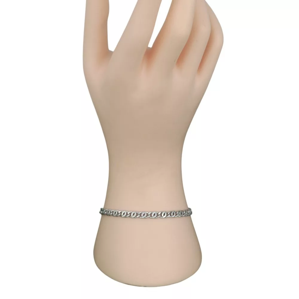 A lapított, szépen csiszolt láncszemek finoman verik vissza a fényt, elegáns, mégsem hivalkodó megjelenést biztosítva. Súlya mindössze 3,4 gramm, így rendkívül kényelmes, szinte észrevétlen viseletet nyújt egész napra, míg a masszív delfinkapocs a biztonságos rögzítésről gondoskodik. Akár önmagában, akár más ékszerekkel kombinálva is remekül mutat.