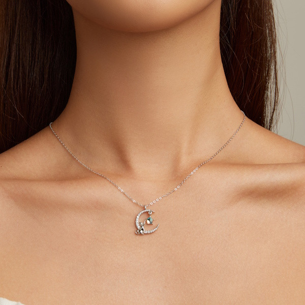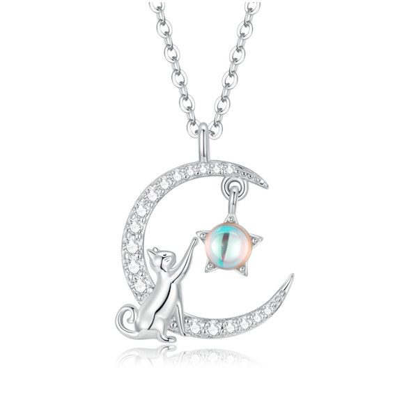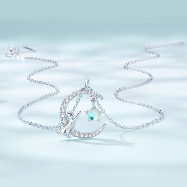 Ez a lenyűgöző, 925 sterling ezüstből készült női nyaklánc egyedi stílusával hódít. A medál központi eleme egy bájos macska, amely a csillagok és a hold társaságában pihen. A macska, a misztikum és az intuíció szimbóluma, gyakran az éjszaka titokzatosságával azonosítják. A csillag és a hold régóta a védelem és az álmok megvalósításának jelképei. A medál cirkóniumkristállyal és holdkővel díszített, amelyek varázslatos fényt kölcsönöznek neki, így minden alkalomra elegáns megjelenést biztosítanak. A 45 cm hosszú és csupán 2.3 g súlyú nyaklánc kényelmes viseletet nyújt a mindennapokban. Tökéletes ajándék lehet szeretteidnek, akik értékelik az egyedi és személyes ékszereket. Viseld ezt a nyakláncot, és engedd, hogy a csillagok és a hold fénye vezéreljen az utadon!