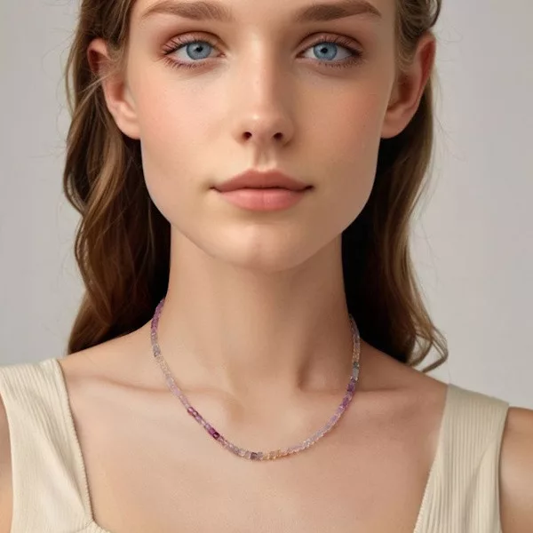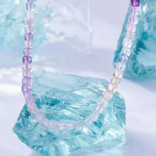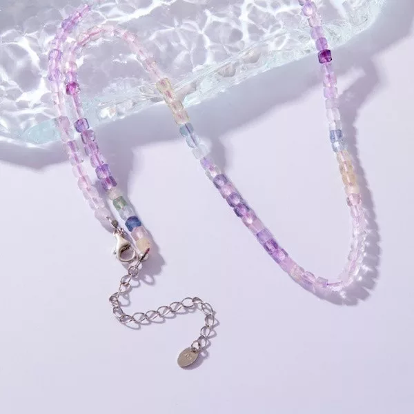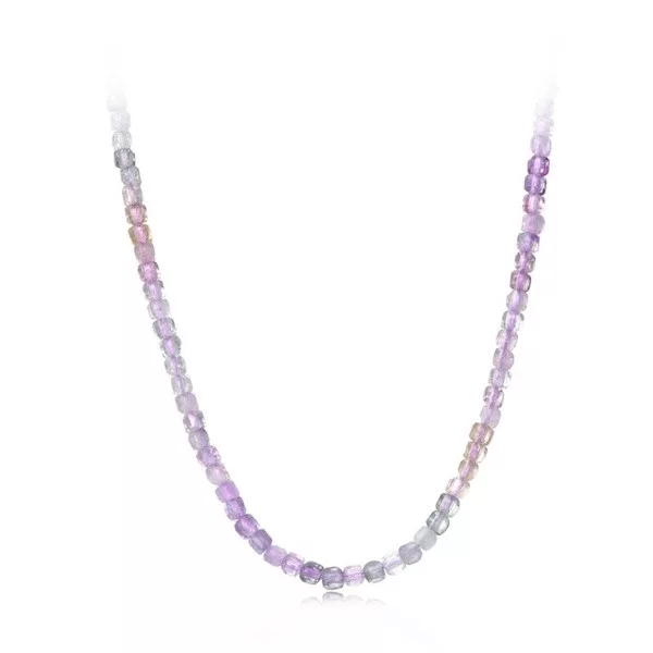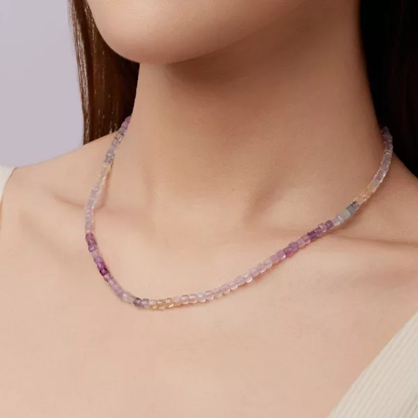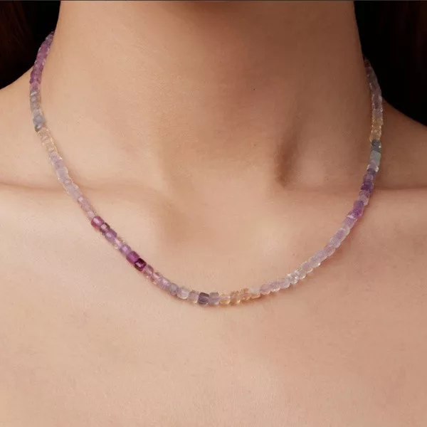 Ez az elegáns fluoritkristályos nyaklánc finoman hangsúlyozza viselője stílusát. Apró, színes fluorit kristálygyöngyökből áll, melyeket egy ezüst színű fém láncra fűztek. A kristályok természetes szépségét a lila, rózsaszín és halványzöld árnyalatok gazdag kavalkádja emeli ki, melyek a fényben csillogva kelnek életre. Letisztult, természetes és nőies stílusa tökéletes mindennapi viselethez és kiváló ajándék lehet minden nőnek.